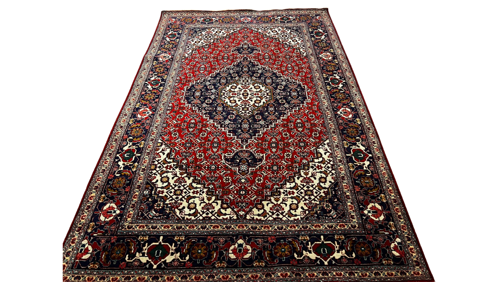 Colors: It predominantly uses a rich, deep red (often derived from madder root dye) for the main field, complemented by navy blue accents in the medallion and borders, with ivory and other colors (green, gold, brown) used for the detailed motifs.